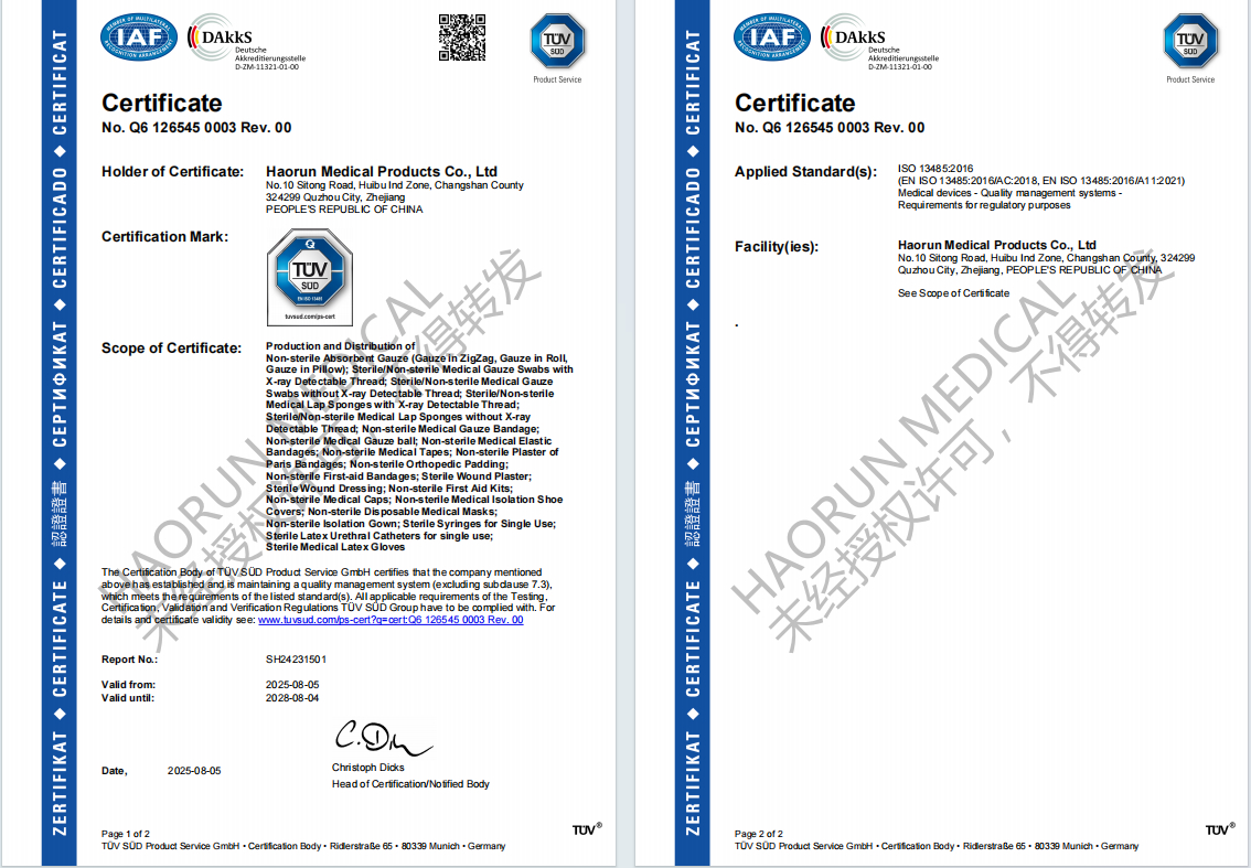 さらなる品質向上を図るため、2023年9月に品質マニュアルおよび手順書の発行を完了しました。これを踏まえ、2024年1月にはMDR関連の内容を追加して品質マネジメントシステム文書を充実させました。当社は、2025 年 4 月 10 日に TUV SUD 監査の第 1 段階に合格し、その後第 2 段階にも合格しました。最後に、今年 8 月に、当社の認証番号が認証機関のシステムで閲覧できるようになり、Haorun Medical の品質管理システムが新たな一歩を踏み出し、会社の発展基盤が強化されました。当社の使い捨て医療消耗品(ガーゼ、ガーゼロール、ガーゼ包帯など)は、世界中のお客様に優れた製品品質とサービスを提供しています。