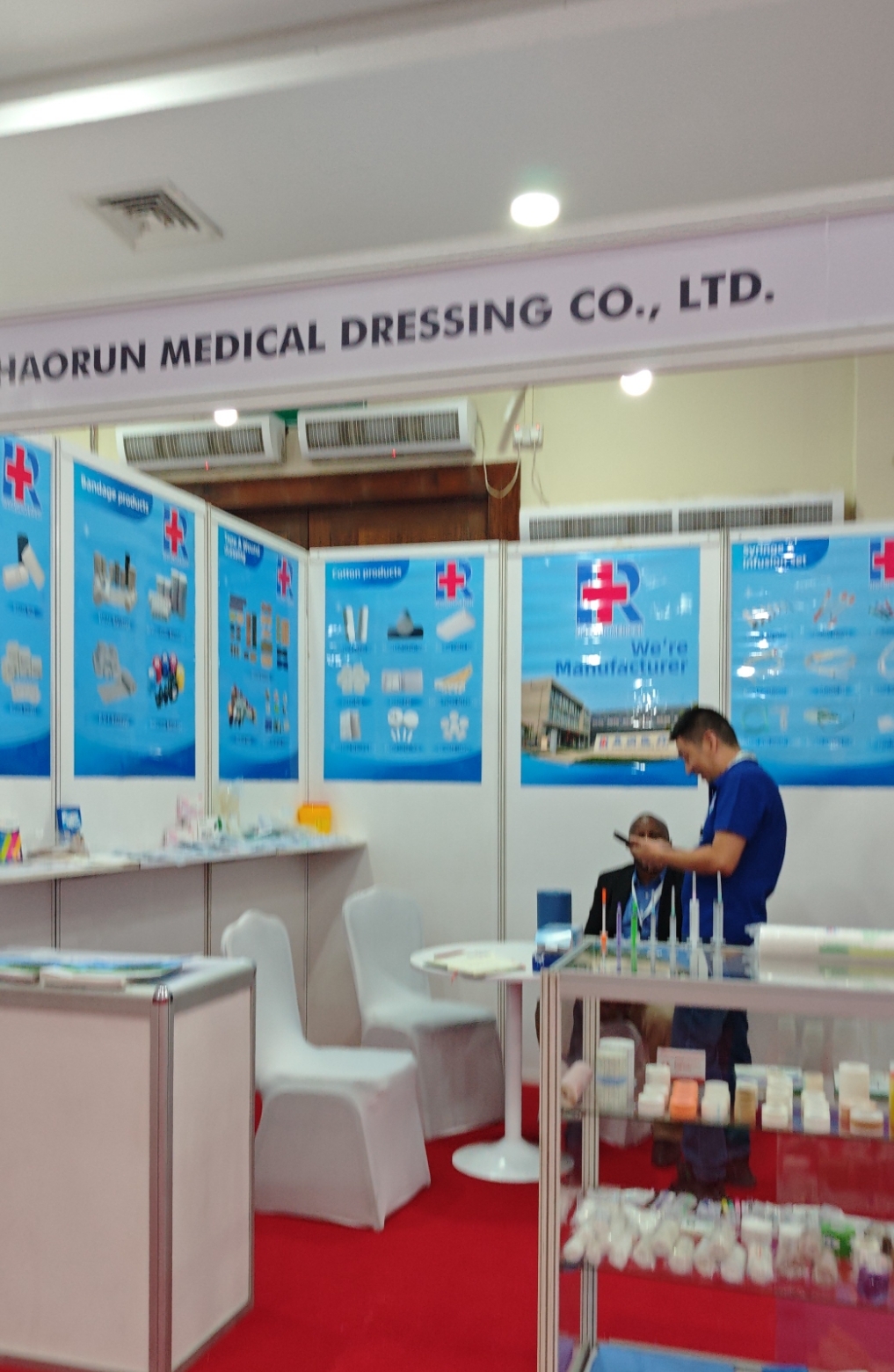 HAORUN MEDICALのブースに足を踏み入れると、目を引く企業ロゴとシンプルかつ洗練されたレイアウトが印象的。ブース内には、創傷ケアや手術補助など多分野の医療用包帯製品が整然と展示されています。スタッフはご来店いただいたお客様に商品の特徴やメリットを熱心に説明し、質問にも丁寧に答えてくださり、現場のコミュニケーションは活発な雰囲気です。